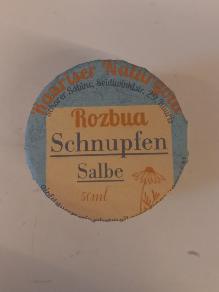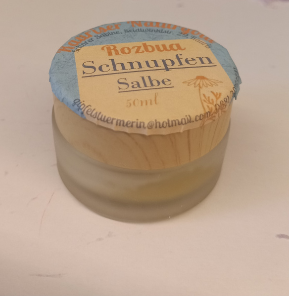 die mittlerweile bewährte Schnupfensalbe mit Thymian, Majoran und Engelwurz wir auf den Nasenrücken und Nasenflügel geeschmiert. Bei Stirn- und Nebenhöhlen Katarrh auch auf die Stirn und unter die Augenhöhlen auftragen. Mehrmals täglich.